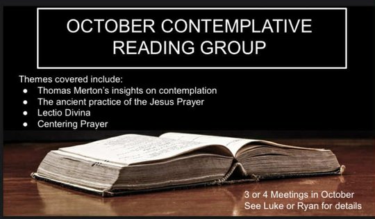 Ryan and Luke kicked off the contemplative reading group, exploring short but rich texts that invite us into reflection, meditation and prayer. Each session will focus on an accessible main reading (with an optional text for those who’d like to go a little deeper), covering themes such as Thomas Merton’s insights on contemplation, the ancient practice of the Jesus Prayer, the tradition of Lectio Divina, and modern approaches like Centering Prayer. Our hope is to create space for thoughtful discussion, possibly a variety of contemplative practices, and shared encouragement on the journey of faith. The next two meetings are November 5th and 19th, and this is held at the church.